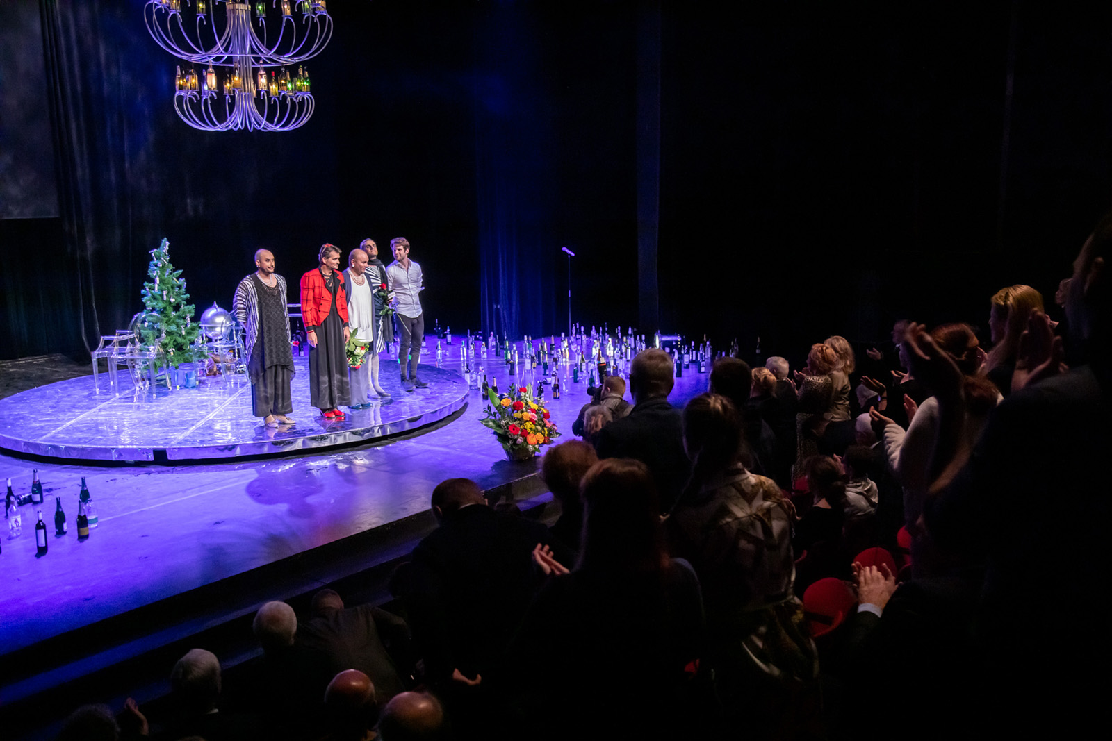 Štyria muži, štyria herci, štyri charaktery, štyri rovnocenné divadelné prejavy, ktoré si zaslúžia nefalšovaný potlesk. Gregor Hološka v úlohe Hedvigy, Peter Trník v úlohe Irmy, Ján Jackuliak ako Marion a Ondrej Antálek s postavou bývalej tanečnice Constance. Každý mal v inscenácii dostatočný priestor ukázať svoje herecké schopnosti a mieru pre nefalšovaný humor. Jediný „muž“ , ktorý v postave Jacoba narúšal veselú zábavu popíjajúcich a tak trochu aj senilných žien, bol talentovaný mladý Matúš Kvietik. Určite návšteva v hľadisku, jeho dedo, slávy slovenský herec Štefan Kvietik, bola láskavým prejavom úcty k herectvu. Kvietik aj prostredníctvom vnuka bude večne živý.